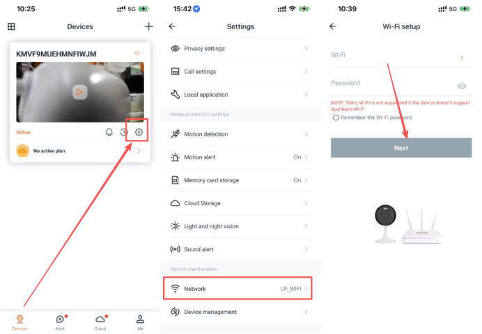 Find the corresponding camera in the APP, click Settings (gear button)->Network->select setup mode ->select the network name you changed and enter the password to configure the network.