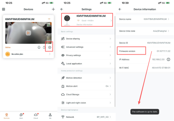 Find the camera you need to update in the APP, click Settings (Gear Button) -> Camera Info -> Firmware Version will be checked and upgraded automatically when you click it.