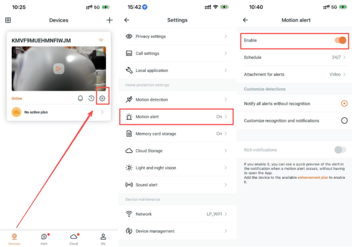 Click "APP ->Device", enter corresponding camera Settings (gear button) -> select Mobile Alerts and keep enable ” on”, default is 24/7 on.