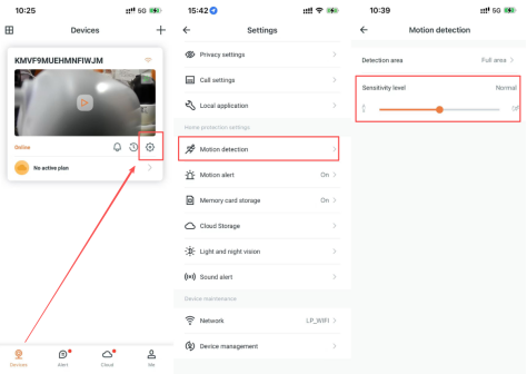 Open the APP, select your camera, click the gear button to enter the settings, select “Motion detection”, set the sensitivity level can be adjusted to "High".