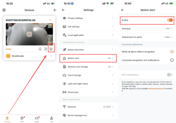 Click "APP ->Device", enter corresponding camera Settings (gear button) -> select Mobile Alerts and keep enable ” on”. By default, motion alerts are enabled 24/7, if you set time policy in "Schedule", mobile alerts will be generated during the set time period.