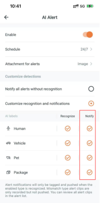Note: All alarm records are pushed by default without marking. However, cameras added to the AI plan (paid subscription required) or cameras with AI detection capabilities will push alarm records with tags by default.